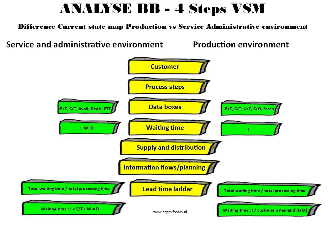 Serious Stuff – Lean – Green & Black Belt Cartoon-00218-LSS-BB-ANALYSE-4-steps-VSM-Difference-current-state-map-Production-vs-Service-Administrative-Environment Afbeelding 221 van 304